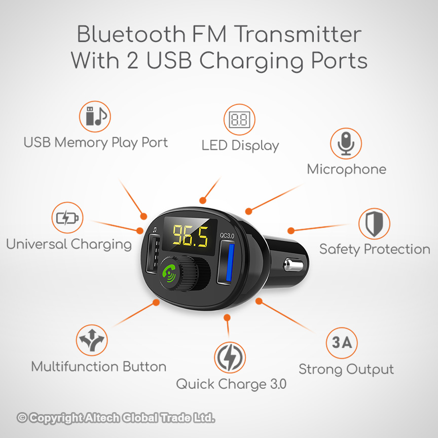 Introducing our Gadjet Wireless BT FM Transmitter with Quick Charge Technology, boasting crystal clear audio and an array of convenient features. With its wireless Bluetooth connectivity, hands-free calling capability, USB audio mode, and dual USB ports for quick charging, this transmitter ensures a seamless and enjoyable driving experience.