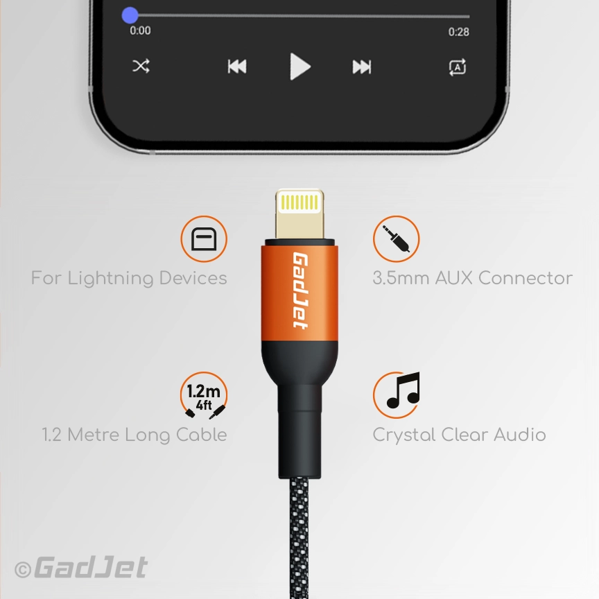 The 1.2m braided GadJet AUX to Lightning Audio Cable combines durability with versatility, offering seamless connectivity between your devices. Enjoy high-fidelity sound transmission and hassle-free usage with reinforced connectors and tangle-free design.