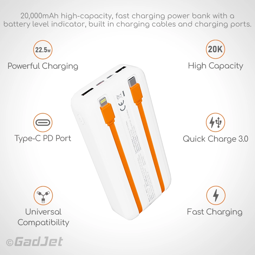 - 20,000mAh large capacity for hours of charging