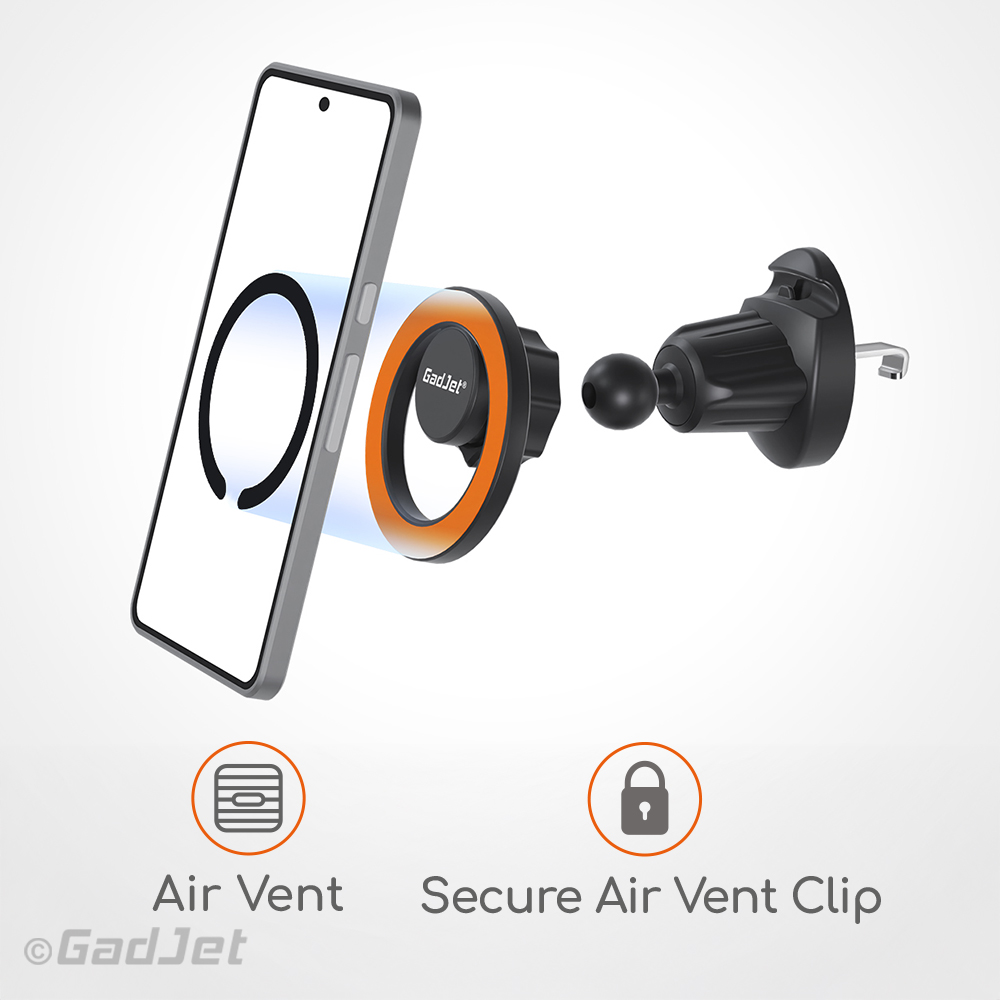 The GadJet MagJet Hook Clip Vent Phone Holder offers strong magnetic hold, full angle adjustment and secure air vent mounting for MagSafe and non-MagSafe phones.