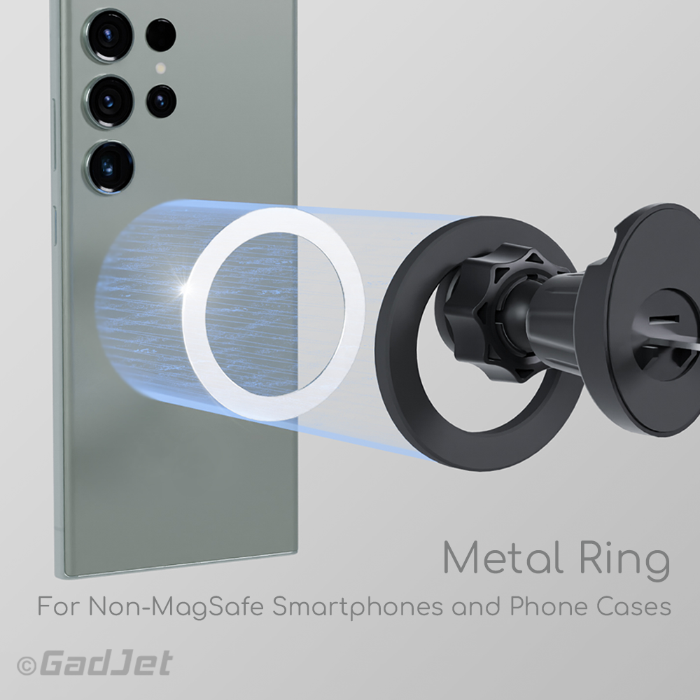 The extra metal ring included with the GadJet MagJet Hook Clip Vent Phone Holder allows non-MagSafe devices to securely attach to the holder. This ensures compatibility with a wide range of smartphones and phone cases.