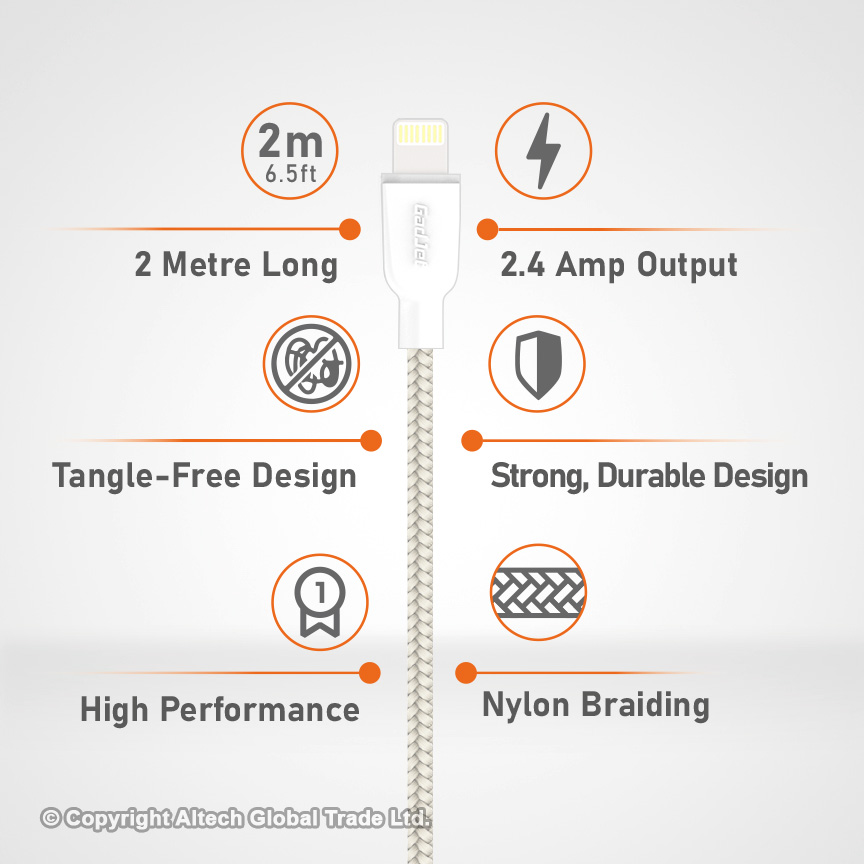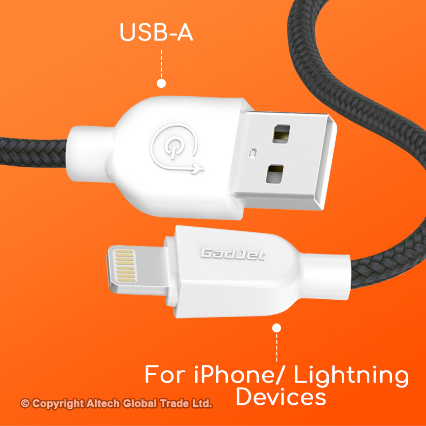 Crafted with durable nylon braided material and boasting a strong 2.4A output, the GadJet 2m Lightning Cable ensures fast and reliable charging for your devices.